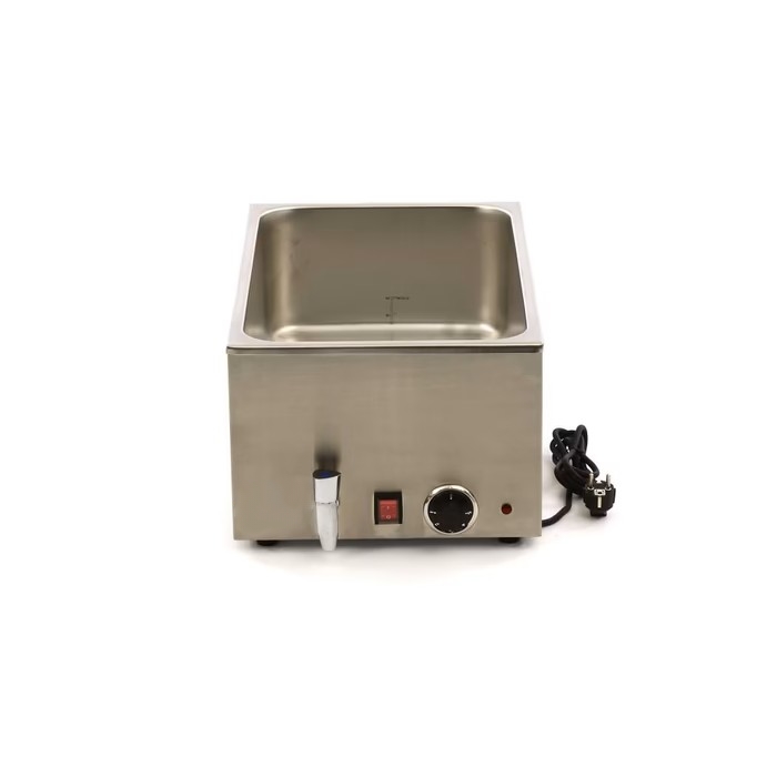 Optimisez vos services à chaud avec ce bain-marie professionnel en acier inoxydable, une unité de table performante de 8 kg équipée d’un robinet de vidange et d’une puissance de 1200W. Conçu pour accueillir des bacs jusqu’au format $1/1$ GN (15 cm de profondeur), cet appareil garantit un maintien précis de vos préparations entre 30 et 95°C grâce à son thermostat réglable et sa cuve soudée sans soudure. Entièrement sécurisé par un bouton d’alimentation protégé et des pieds antidérapants, ce matériel robuste conforme aux normes HACCP assure une conservation thermique homogène et une simplicité de nettoyage exceptionnelle pour toutes les cuisines professionnelles.