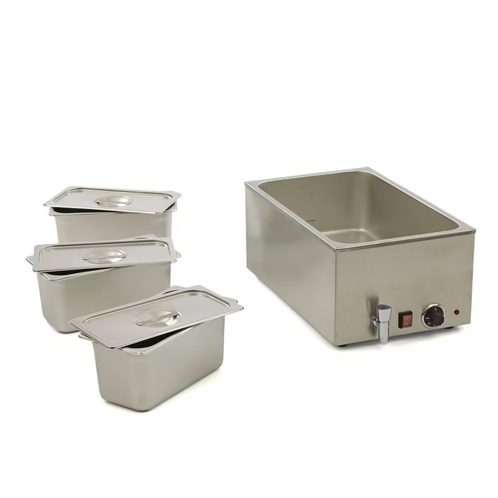 Diversifiez votre offre chaude avec ce bain-marie professionnel en acier inoxydable, une unité de table de 8 kg équipée d’un robinet de vidange et livrée avec trois bacs GN 1/3 (15 cm de profondeur). Sa puissance de 1200W assure un maintien thermique de haute précision entre 30 et 95°C, idéal pour conserver simultanément trois sauces ou accompagnements grâce à sa cuve robuste soudée sans soudure. Entièrement sécurisé par un bouton d’alimentation protégé et des pieds antidérapants, ce matériel conforme aux normes HACCP garantit une conservation exemplaire de vos saveurs et une facilité d’entretien exceptionnelle pour toutes les cuisines professionnelles à forte cadence.