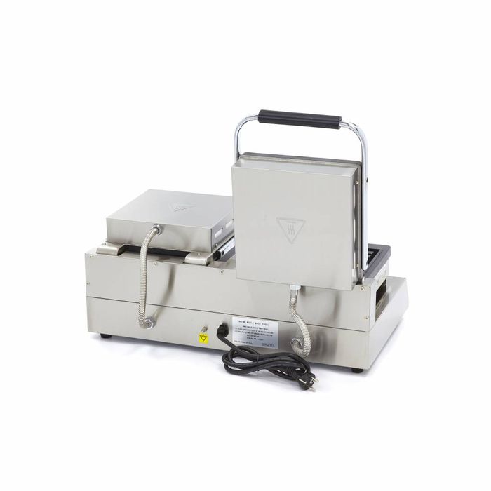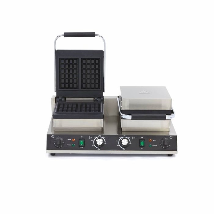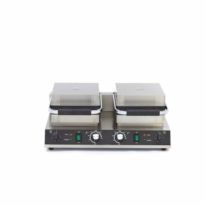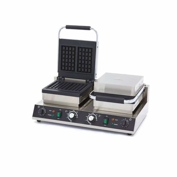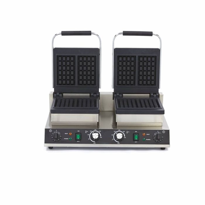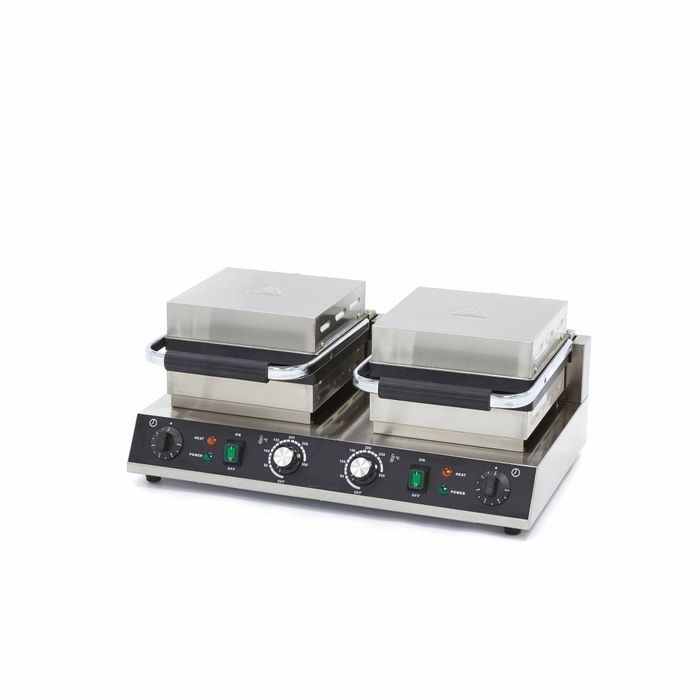 Parfaitement adapté aux exigences des snacks et salons de thé, ce gaufrier robuste double zone permet de réaliser des gaufres de 10 x 16,4 cm avec une régularité exemplaire. Équipé de plaques antiadhésives en aluminium haute performance et d’un thermostat de précision (50-300°C) sur chaque unité, il assure une stabilité inébranlable et une productivité maximale pour vos services les plus denses. Son châssis industriel en acier inoxydable de 18 kg (B63 x D38 x H27 cm) et son ergonomie sécurisée en font un équipement stratégique pour les professionnels cherchant à allier puissance de chauffe et qualité gastronomique. Ce modèle performant de 3000W (2 x 1500W) garantit une montée en température efficace pour un débit constant.