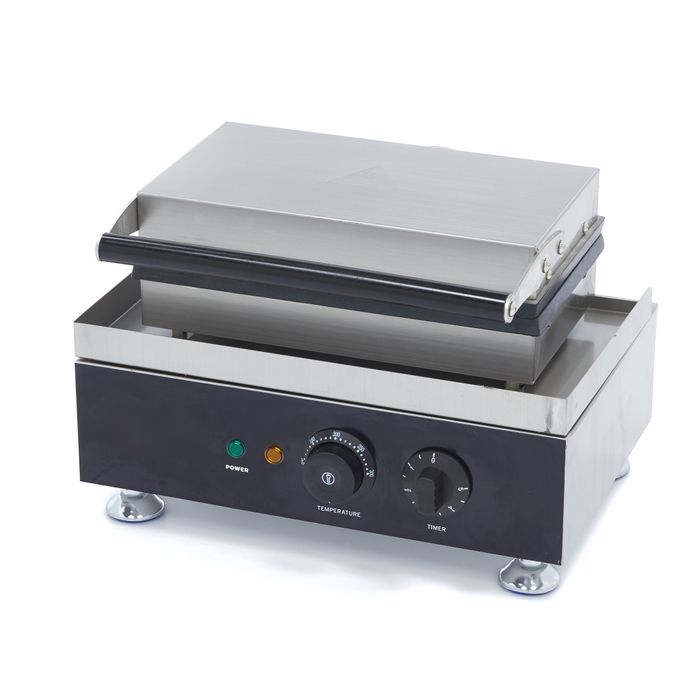 Le boîtier lisse en acier inoxydable et le bac de récupération amovible facilitent l’élimination des surplus de pâte. Les plaques antiadhésives se nettoient rapidement à l’aide d’une brosse souple ou d’un chiffon humide, garantissant une hygiène irréprochable conforme aux normes HACCP sans effort supplémentaire en fin de service.