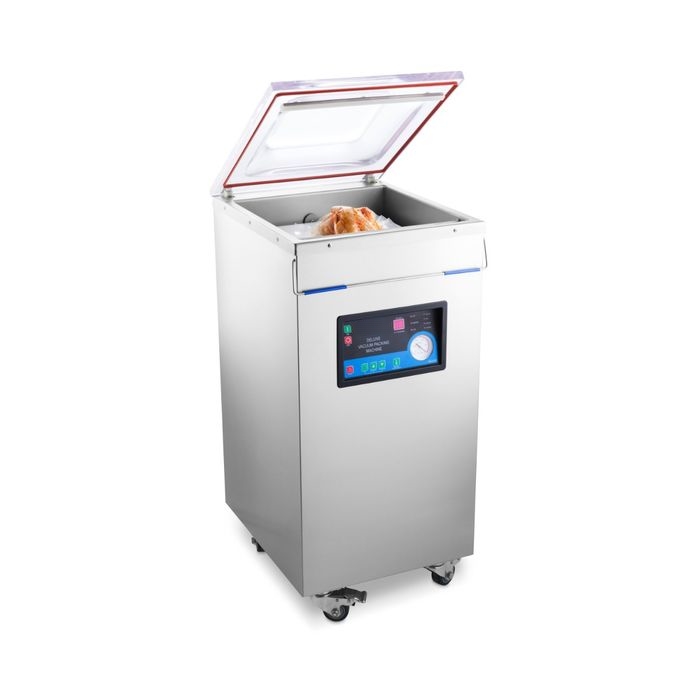 La polyvalence de votre chaîne de froid est assurée par une chambre de 42 x 44 cm, capable d’accueillir des sacs de grande envergure grâce à sa barre d’étanchéité de 40 cm. Le couvercle incurvé haute résistance n’offre pas seulement une visibilité parfaite sur le processus, il permet également de maximiser la hauteur utile pour les produits volumineux sans compromettre la qualité du scellage de 8 mm. La sécurité est au cœur de ce modèle de sol avec un interrupteur d’arrêt immédiat intégré au couvercle, assurant une protection totale de l’opérateur durant les phases intensives. Facile à entretenir grâce à son boîtier lisse en acier inoxydable et livrée avec son kit de maintenance, cette machine à emballer sous vide s’impose comme le cœur névralgique des boucheries, charcuteries et cuisines centrales exigeantes.