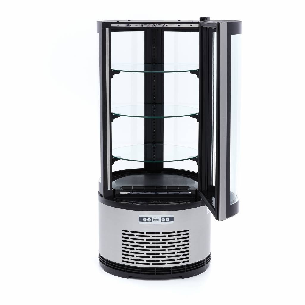 Sublimez vos pâtisseries et créations gourmandes avec cette vitrine réfrigérée ronde de 100 litres noire, une solution d’exposition cylindrique inédite dotée d’étagères rotatives pour un impact visuel à 360°.